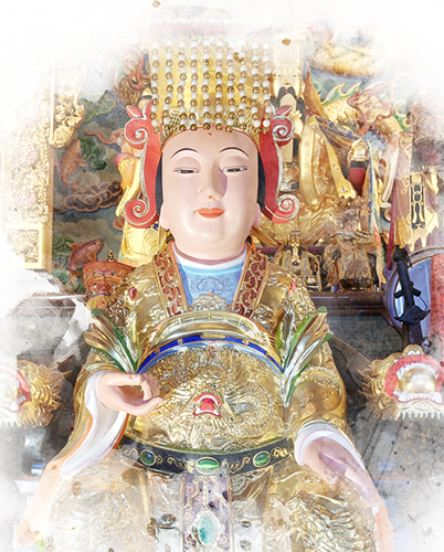 媽祖,尊稱 天上聖母,本名林默娘,福建莆田人,生於宋代。自幼仁慈聰慧,濟世救人,尤其關懷漁民航海安全,傳說她能驅風浪、護航行,廣受沿海民眾敬奉。
